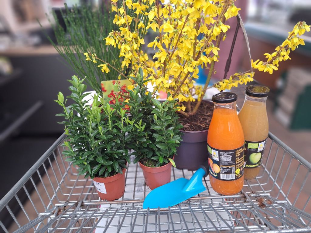 I bym nie była sobą, gdybym do wózka nie włożyła dwóch małych bukszpanów, które teraz rosną w donicach przed domem, forsycji, czyli tzw złotego deszczu i pachnącego żarnowca.