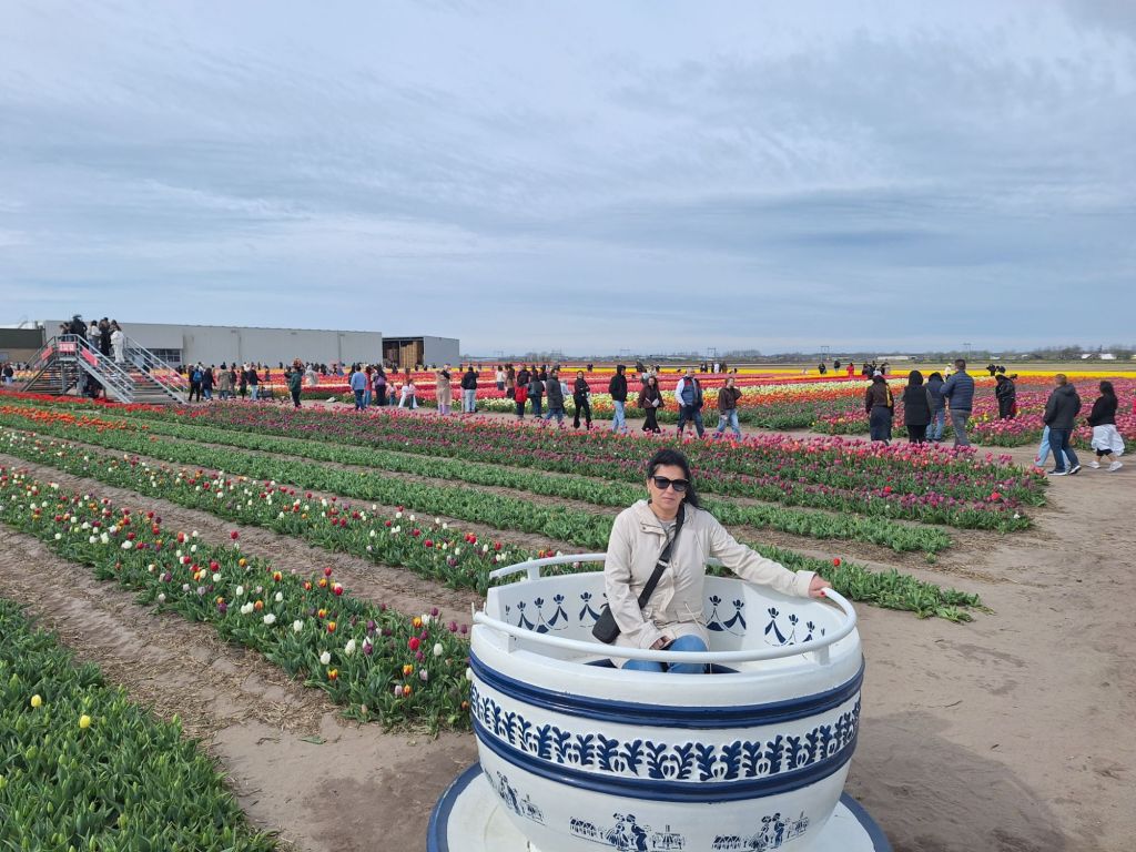 Tulipany kwitną tylko kilka tygodni w roku, a każdy dzień wygląda trochę inaczej. Warto śledzić media społecznościowe ogrodu, aby być na bieżąco i podglądać rozkwit. Wczesnym rankiem panuje tam miękkie światło i jest mniej ludzi a późnym popołudniem firma zaprasza na „złotą godzinę”. Oczywiście trzeba przestrzegać paru zasad, np trzymać się wyznaczonych ścieżek, nie zrywać i nie deptać kwiatów. Warto też założyć coś ciepłego z kapturem, bo na polach i otwartej przestrzeni jest wietrznie. Mnie przewiało, ale widziałam, jak dziewczyny zdejmowały kurtki, pokazując się w cienkich i zwiewnych sukienkach, żeby zapozować do idealnych zdjęć.
