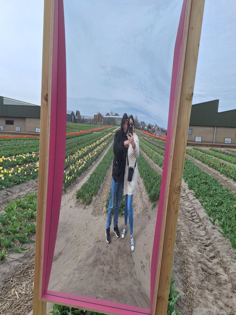 Byliśmy już kiedyś w słynnym ogrodzie tulipanowym Keukenhof. Jest piękny, to fakt. I jest też najczęściej odwiedzanym ogrodem wiosną. Trzeba naprawdę dobrze trafić, żeby ludzi było mniej. Inaczej trudno o zrobienie dobrych i ciekawych zdjęć. Przynajmniej ja tak miałam. Dlatego tym razem wybór padł na pola tulipanów. Znalazłam w internecie równie popularne i ładne miejsce, czyli The Tulip Barn. Obserwuję ich na Instagramie i TikToku. Kupiłam więc dwa bilety za 20€, wybrałam datę i godzinę i pojechaliśmy.