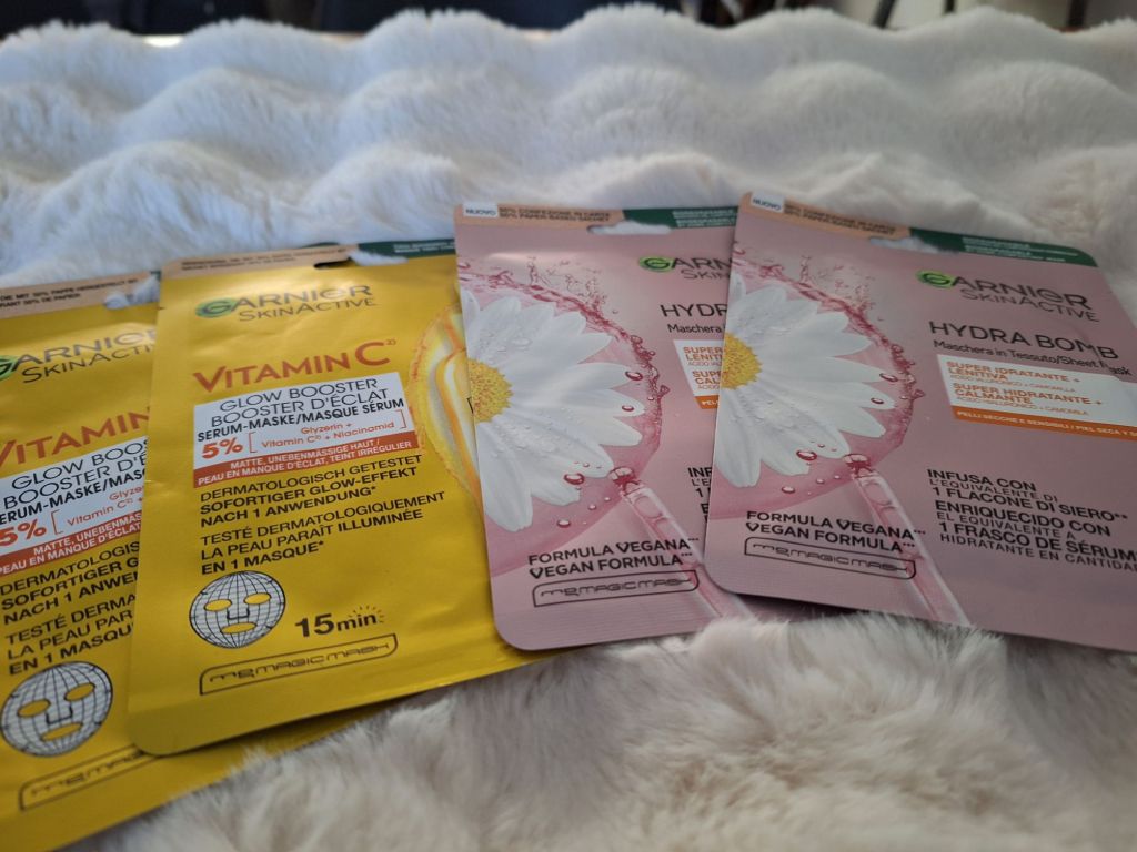 Moje niedawne odkrycie, czyli maski w płachcie Garnier. O tych różowych już pisałam. Była znowu promocja 1+ 1 gratis, więc kupiłam też te z wit C. Uwielbiam je.