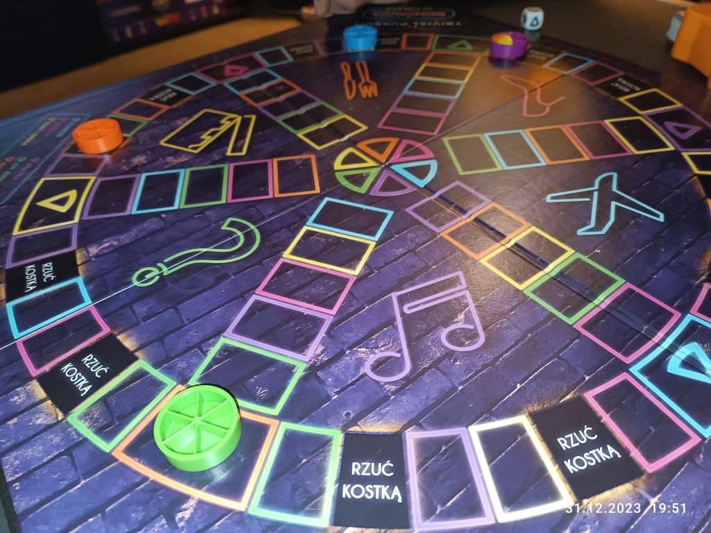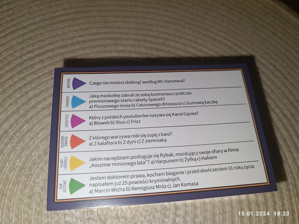 Ta gra jest rewelacyjna. Po pierwsze ma aż 1800 pytań, kategorie do wyboru, a po drugie lubię gry, gdzie trzeba mózg wysilić i odpowiadać na trudne pytania. A w tym przypadku bywało ciężko. W skrócie polega ona na tym, że czyta się pytanie przeciwnikowi, który wybiera kategorię. Rzuca się też kostką, bo trzeba zebrać kolorowe trójkąciki. Kto pierwszy, ten wygrywa. O ile odpowie poprawnie na ostatnie trudne pytanie .