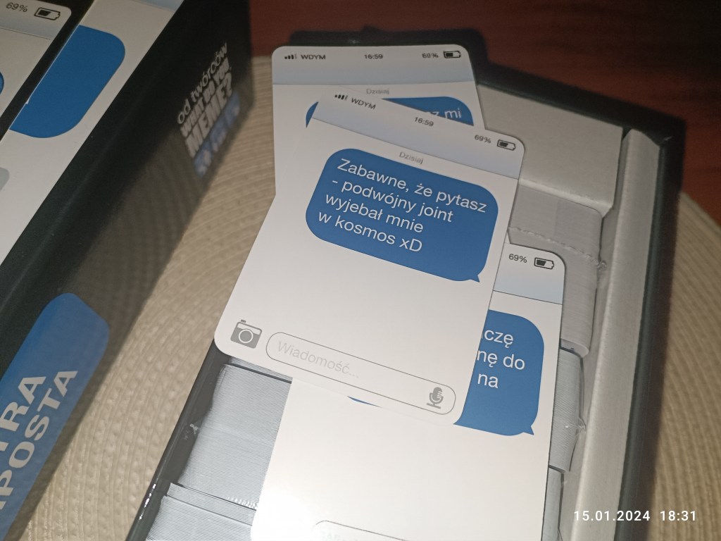 Gra dla ludzi z poczuciem humoru. W zestawie znajduje się 150 kart z wiadomościami i 300 kart z odpowiedziami. Jedna osoba losuje kartę „wiadomość” a pozostali muszą dobrać do niej odpowiednią ripostę. Trzeba by być przy tym ostrym i bezlitosnym. Mamy do wyboru mnóstwo zabawnych kombinacji.