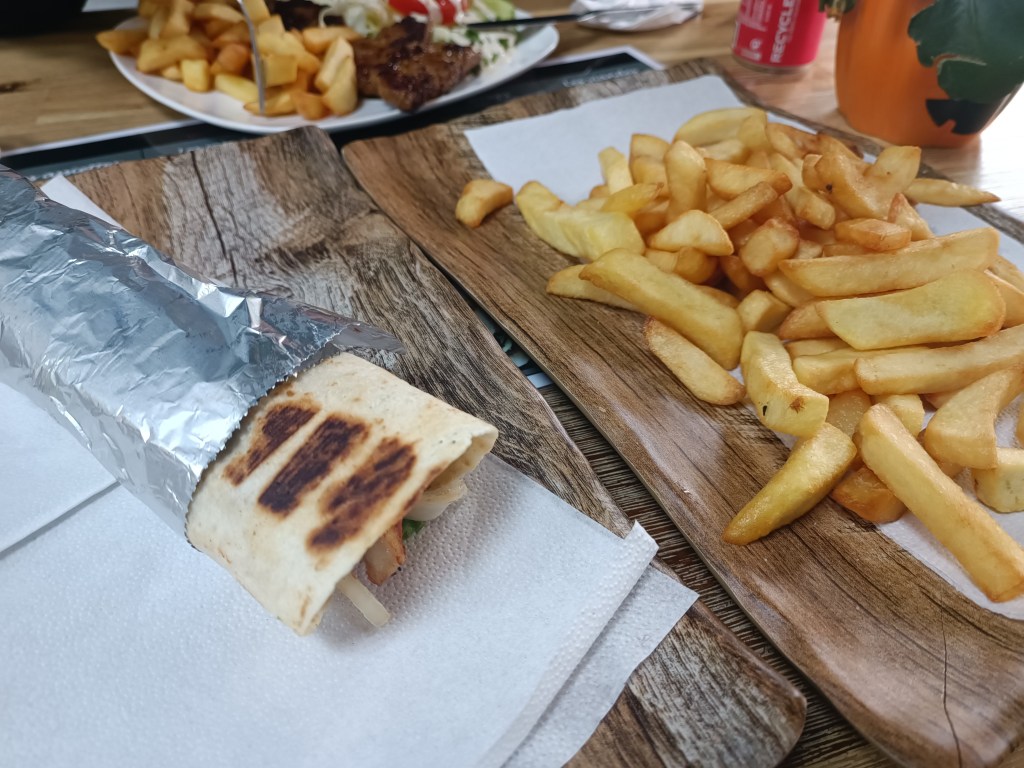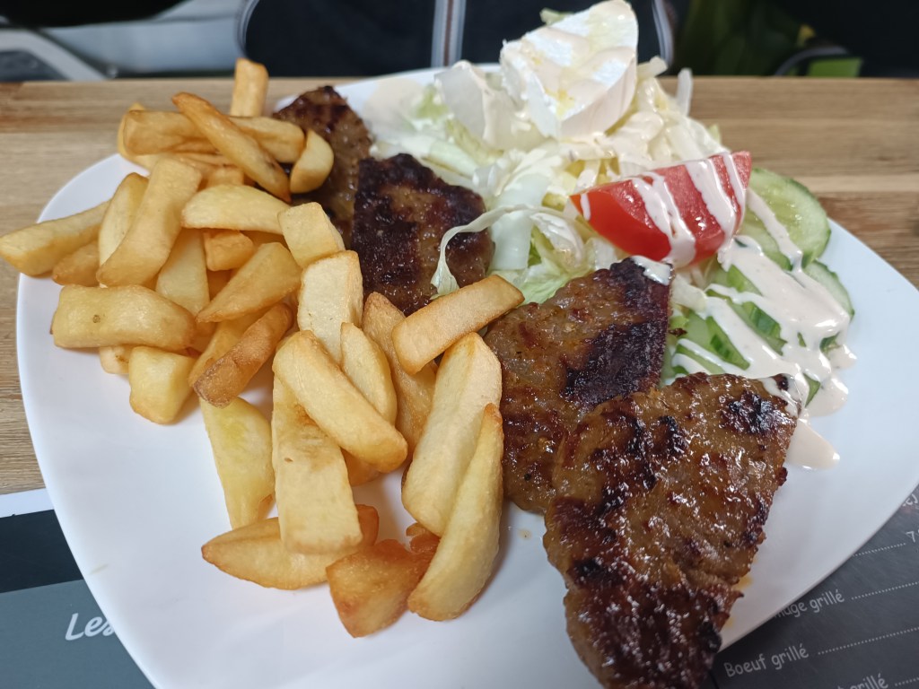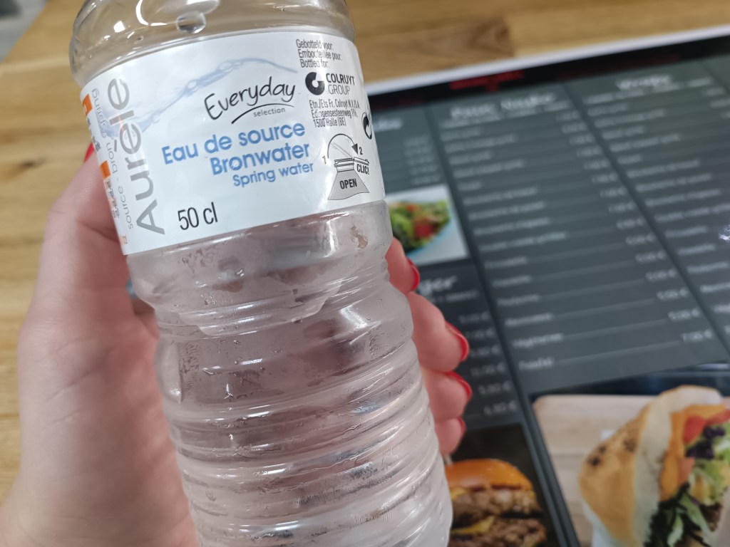 Gdzie jedliśmy? Spotkaliśmy na swojej drodze restauracje: meksykańską, chińską, tajlandzką. Niektóre były akurat zamknięte. Szukaliśmy pizzerii. Trafiliśmy na niepozorną knajpkę na rogu ulicy. Małą, ale było w niej sporo ludzi. Menu bogate. Od hamburgerów przez wrapy, po sałatki. Weszliśmy. Dogadaliśmy się w miarę po angielsku. Jedzenie dobre i syte. Frytki belgijskie też musiały być 🙂 Aha, i belgijska woda mineralna jest naprawdę pyszna!