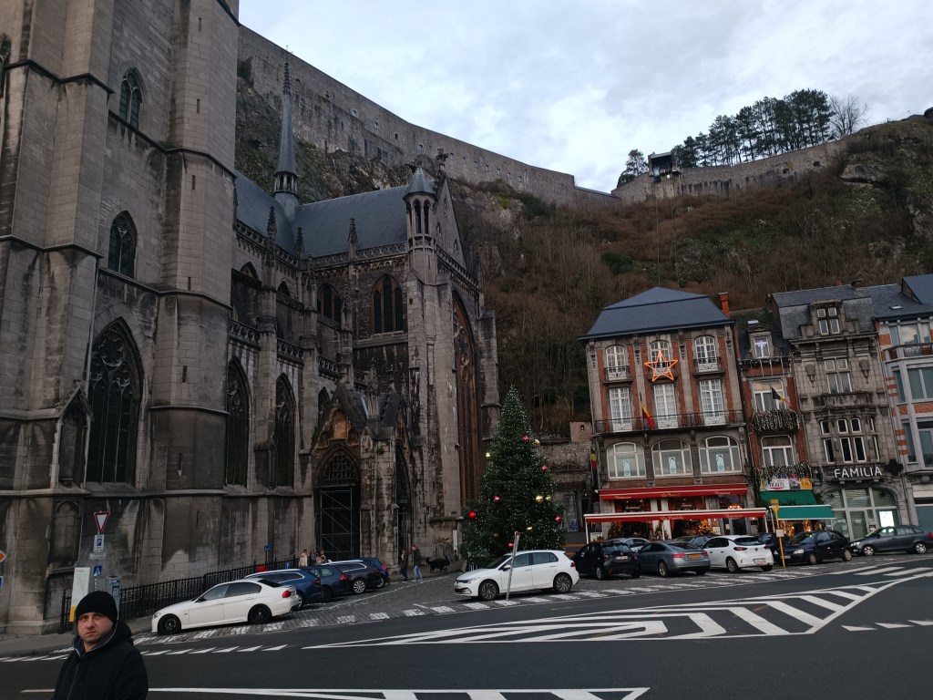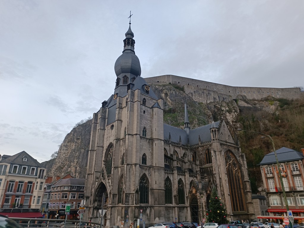 Kolejnym punktem jest Kolegiata Najświętszej Marii Panny. Została przebudowana w stylu gotyckim na starych fundamentach po tym, gdy w 1227 r spadające z pobliskich klifów kamienie częściowo zniszczyły poprzedni romański kościół. Powyżej kościoła wznosi się pionowa skała z ufortyfikowaną Cytadelą. Została ona wybudowana by kontrolować dolinę Mozy. Biskup Liege przebudował i powiększył Cytadelę w 1530r. Została ona zniszczona w 1703r przez Francuzów. Istniejąca do dziś budowla powstała po przebudowie w 1821r gdy Dinant należało do Królestwa Zjednoczonych Niderlandów. Na Cytadelę można się dostać za pomocą 408 schodów lub kolejką linową. My niestety nie zdążyliśmy. Czynne było do 16:30. Chciało nam się jeść i teraz żałujemy, że nie odłożyliśmy posiłku na później. Widziałam w internetach, że widok z góry zapiera dech. A ja lubię podziwiać miasta z góry, mimo że mam lęk wysokości.