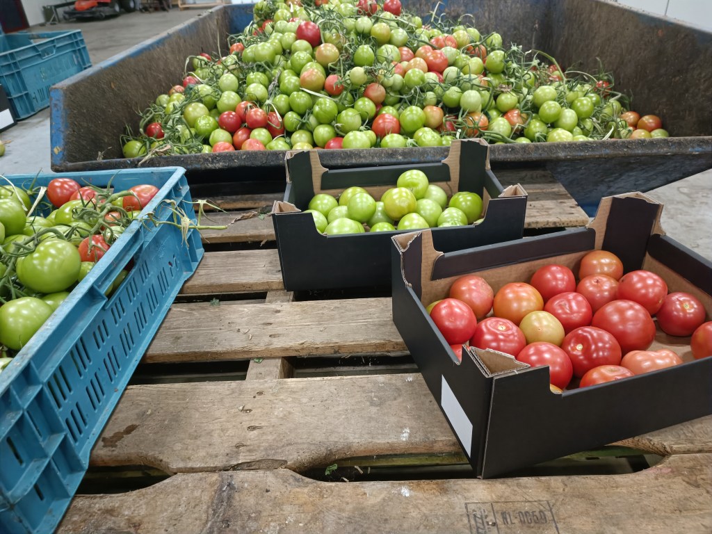 Będzie trochę o mojej pracy, trochę o ludziach, z którymi pracowałam i z którymi pracuję i trochę zdjęć. Zacznę od tego, że we wrześniu zawsze jest łamanie „głów” plantów pomidorów. Chodzi o to, żeby urwać czubki, żeby dalej już nie rosły. Od tego momentu na plancie zostaje około 5-6 trosów z pomidorami i przez 5-6 tygodni wszystko jest wycinane i tym sposobem zbliża się likwidacja, czyli czyszczenie szklarni i przygotowanie na nowy sezon. Po powrocie z urlopu, moja praca głównie polegała na przebieraniu najgorszego sortu pomidorów. Oczywiście nadal się waży dobre skrzynki, po które przyjeżdżają jeszcze tiry, ale oprócz tego, trzeba pozbyć się najgorszego gówna. Wtedy wyrzuca się nie tylko zgnite warzywa. Trzeba oddzielić dobre zielone, pomarańczowe i czerwone od tych złych, z plamami, z pęknięciami itp. Tego jest ogrom i przyjeżdżają do nas pełne plastikowe skrzynki. W kontenerze lądują kilogramy pomidorów nienadających się na sprzedaż.
