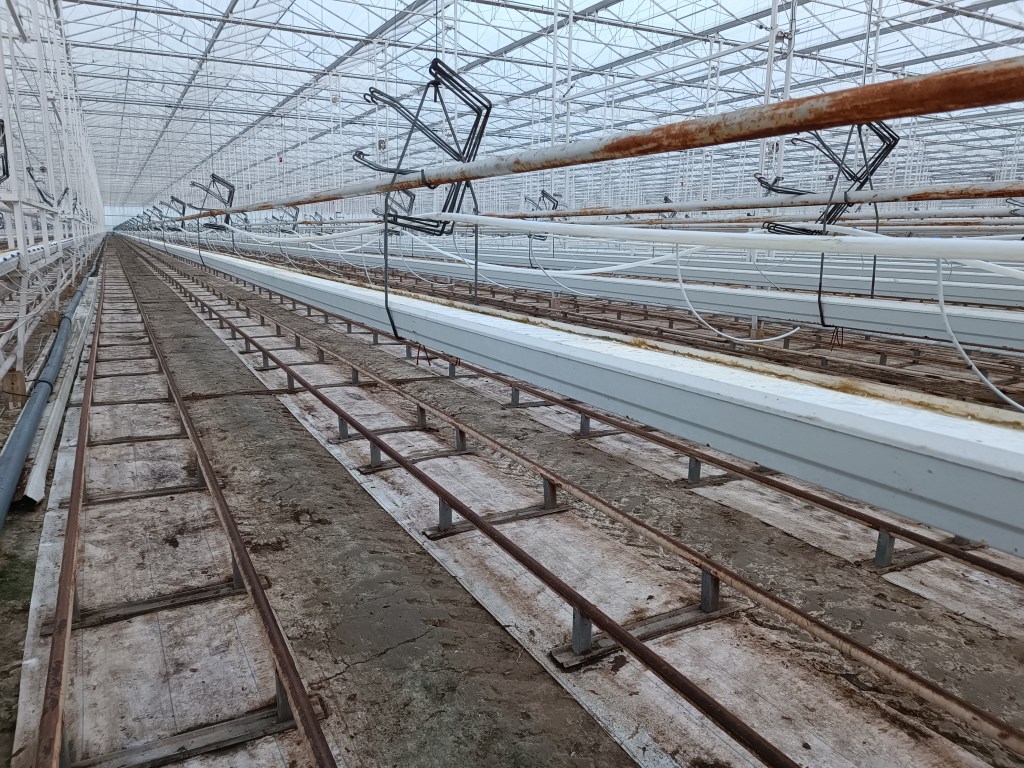 Zdjęcie wyżej przedstawia wyczyszczoną szklarnię. Nie mogło być ani jednego starego pomidora, ani jednego liścia, śmiecia. Wszystko zebrane, pozamiatane. Chodzi o wirusa. Poprzedni sezon nie może „stykać się” ze starym. Nowe planty muszą być bezpieczne. Myte są te białe półki, na których będą rozłożone maty z watą dla plantów. Myta jest cała szklarnia specjalnymi zraszaczami w środku i na zewnątrz. Potem jest gazowanie. Nikogo z pracowników nie może być na szklarni. Pamiętam, gdy trzy lata temu, w piątek skończyliśmy pracę wcześniej, bo miało być właśnie gazowanie. Widziałam, jak wjechały trzy małe pojazdy (coś na kształt wozów opancerzonych :). W środku siedzieli panowie, których było widać tylko przez malutkie szybki i to oni tymi „pojazdami” gazowali. Przez weekend szyby w dachu były otwarte, żeby wietrzyć. Ale w poniedziałek i tak było czuć chlor.