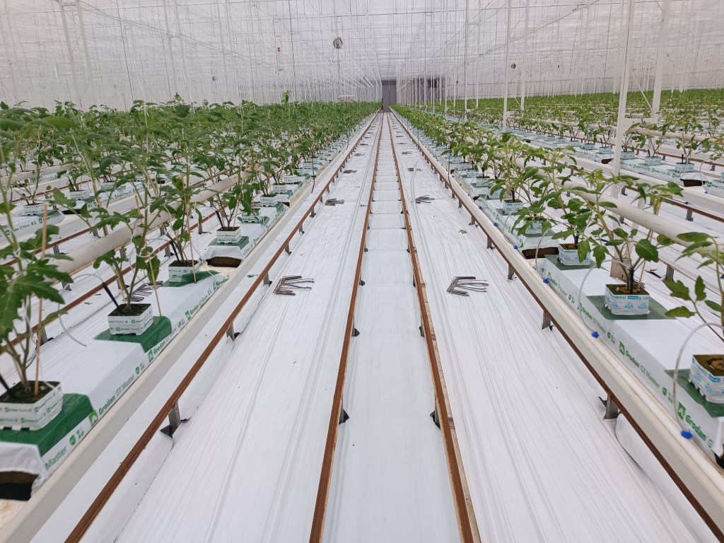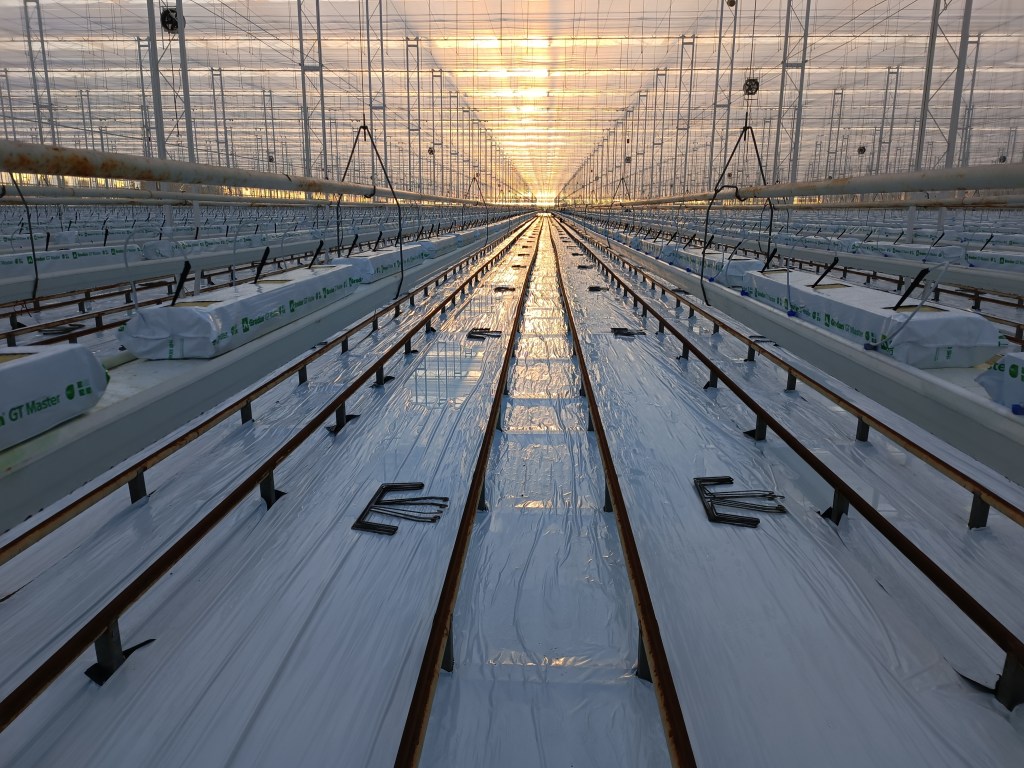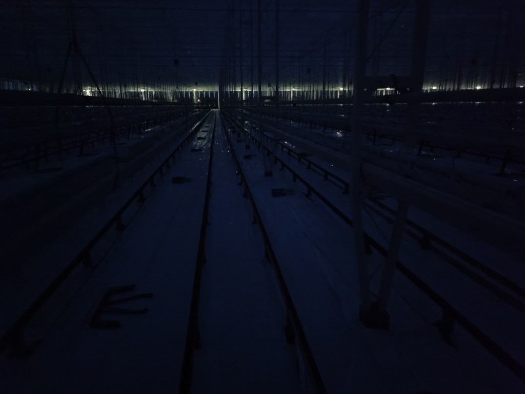 Wschód słońca 🙂 Grudzień. Szklarnia czysta, folia w obawie przed wirusem, tym razem położona wszędzie. Nowe maty na półkach. To właśnie w tym momencie przyjeżdżają nowe planty pomidorów i następuje sadzenie, czyli po prostu ustawiamy je na tych matach. Prosta, spokojna praca. W naszej szklarni nie ma lamp, czyli górnego oświetlenia. W innych firmach jest i słyszałam, że ludzie pracują wtedy nawet na trzy zmiany i jest bardzo gorąco. Nie dla mnie. My zimą, przed sadzeniem często zaczynaliśmy pracę, gdy było jeszcze ciemno. No i chłodno. Mnie pasuje 🙂