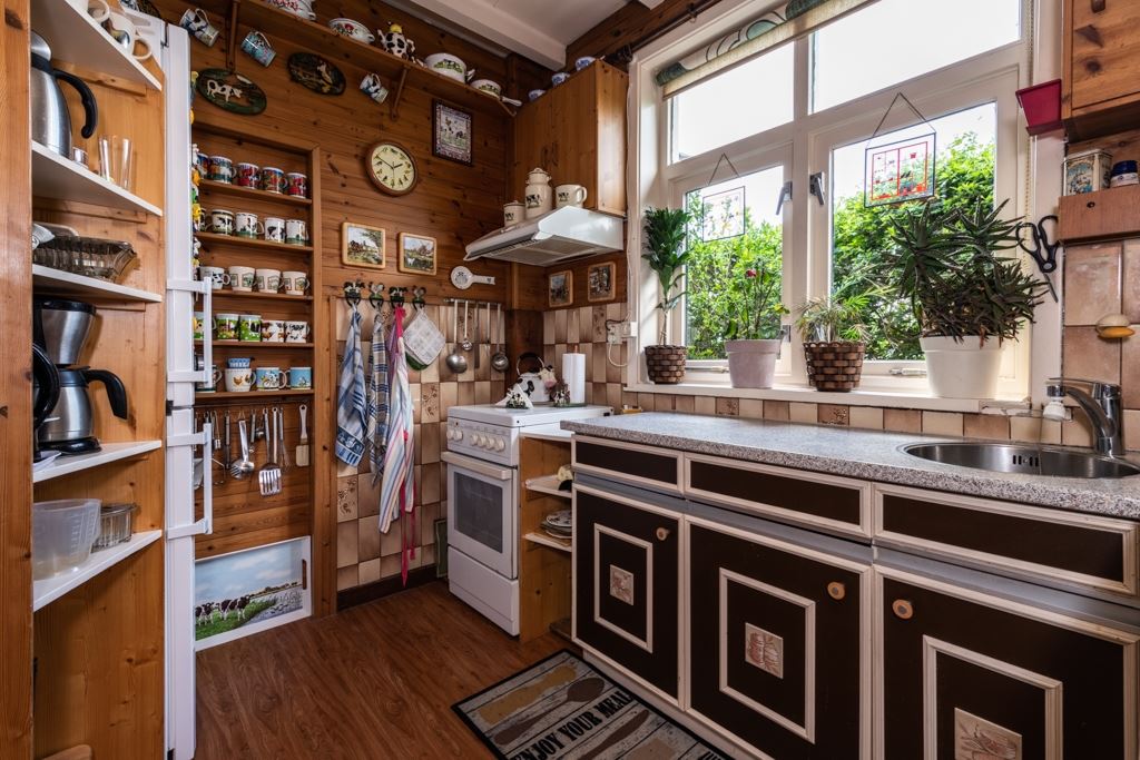 Brąz różnego odcienia i drewno w całej kuchni 🙂 Szafki ciemnobrązowe. Dywanik na podłodze i płytki w kolorach kawy z mlekiem. Moją uwagę zwróciła półeczka z kubkami 🙂 Oprócz tego, mnóstwo obrazków na ścianie, a na okapie urocza kanka na mleko i dwa kubki z motywem krowim. Czajnik także a la krowa 🙂 Po dokładniejszym przyjrzeniu się kubkom, zauważyłam na nich krowy, owce czy kury. W tej kuchni króluje zwierzyna wiejska 🙂