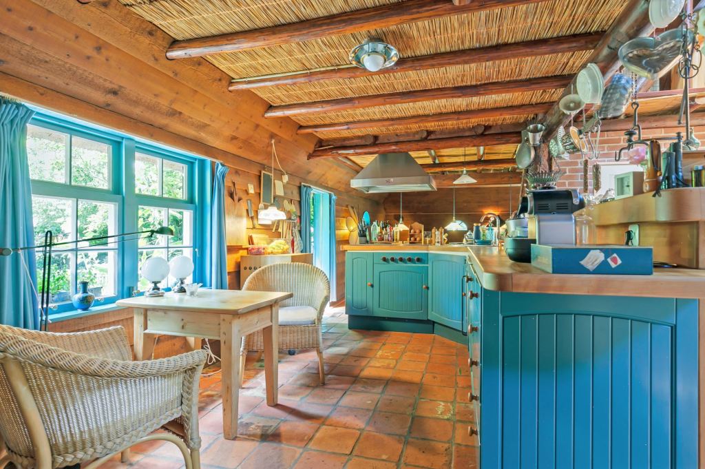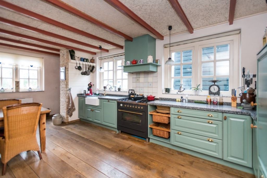 Kolejna kuchnia w wiejskim stylu, ale na niebiesko. Albo miętowo… Jak kto woli 🙂 Drewniana podłoga + krokwie na suficie. Zlew i okap w stylu rustykalnym. Przy oknie, po lewej stronie- półka z wiszącymi chochlami, do tego kawałek ceglanej ściany a na podłodze aluminiowy baniak. Po prawej stronie, na parapecie waga kuchenna a obok okna, kamionka. W Polsce kisimy w niej ogórki, a tu służy do przechowywania łych kuchennych 🙂