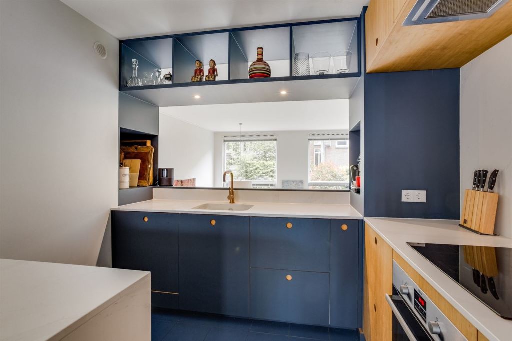 A to już kuchnia z typowego loftu w wielkim mieście typu Amsterdam. Prosta, nowoczesna, bez zbędnych ozdób. Kolor szafek i części ściany- ciemnoniebieski, podchodzący pod granat. Nad zlewem półka ze szkłem i dwiema figurkami. Oprócz tego, na zewnątrz widzimy tylko stojak na noże a po drugiej stronie drewniane tacki i deski. Jest to typ kuchni, w której rzadko się gotuje. Ona ma po prostu wyglądać 🙂