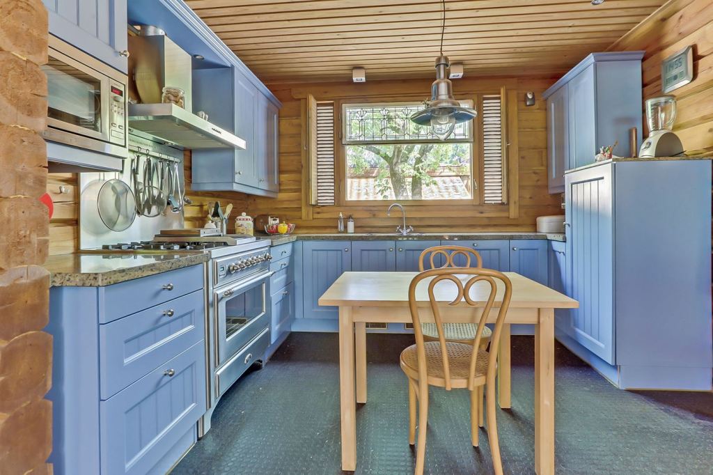 Ściany i sufit drewniane, ale meble już w kolorze błękitu, albo lawendy… Ciężko mi to stwierdzić, bo aż tak mocna w barwach nie jestem. Jak widać, nie tylko faceci mają z tym problem 😉 Brak oszklonych szafek. Wszystko zabudowane i mało wyeksponowanych bibelotów kuchennych. Mimo to, dzięki drewnie i stołowi na środku, kuchnia sprawia wrażenie przytulnej.