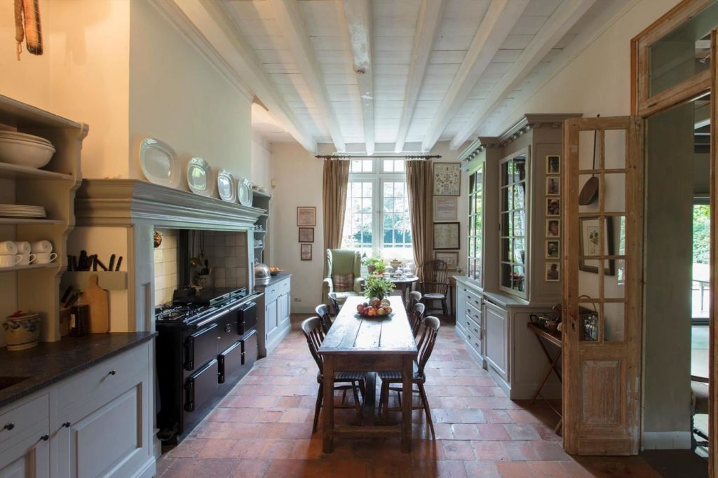Olbrzymia kuchnia z „kącikiem do wypicia herbatki”- tak bym to nazwała 🙂 Pod oknem widzimy mały stolik z fotelem i krzesłem, na ścianie obrazy. Dodatkowo 2 piękne kredensy z porcelaną. Obok większego kredensu stoi malutki stoliczek, na którym postawiono bibeloty, a nad nim wisi obrazek i olbrzymia chochla. Kuchnia gazowa wielkich rozmiarów, stylizowana na starodawny piec. Całość dopełnia duży drewniany stół z pięknymi krzesłami. Kuchnia z klimatem!