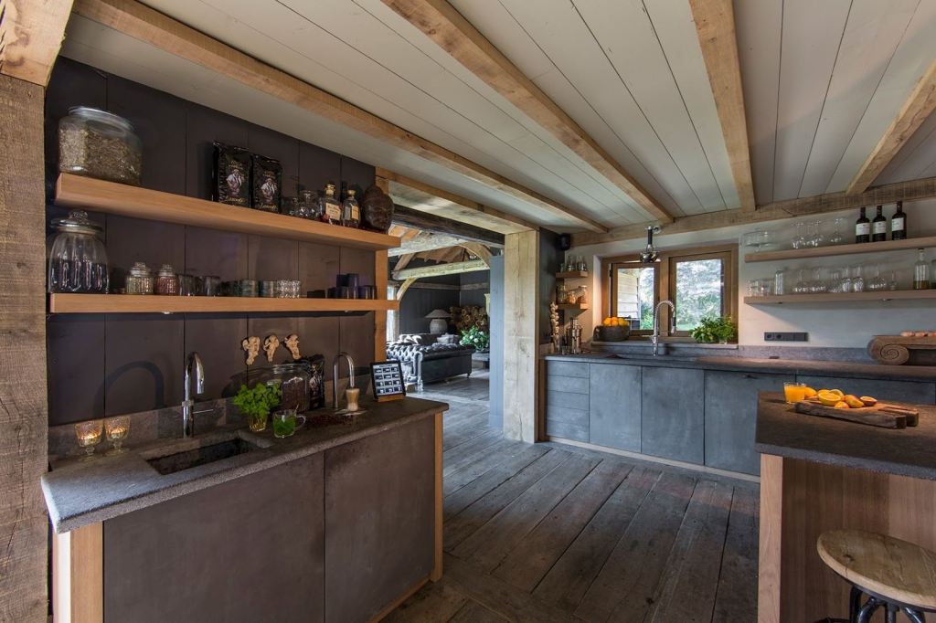 A tu już kolor mocno szary. Kuchnia matowa, nowoczesna, połączona z drewnem. Efekt? Mega! Na podłodze drewno, na suficie krokwie, półki na ścianie niezabudowane- wyglądają tak, jakby ktoś po prostu przykręcił do ściany dechy 🙂 Wszystko wyeksponowane, ale jest zachowany porządek. Nad zlewem widzimy różne ozdobne słoje, w których przechowywane są produkty. Nie zabrakło oczywiście ozdobnych akcentów, jak np trzy aniołki na ścianie obok zlewu, zioła, czy ozdobna drewniana taca po drugiej stronie kuchni. Mnie podoba się także drewniane okno 🙂